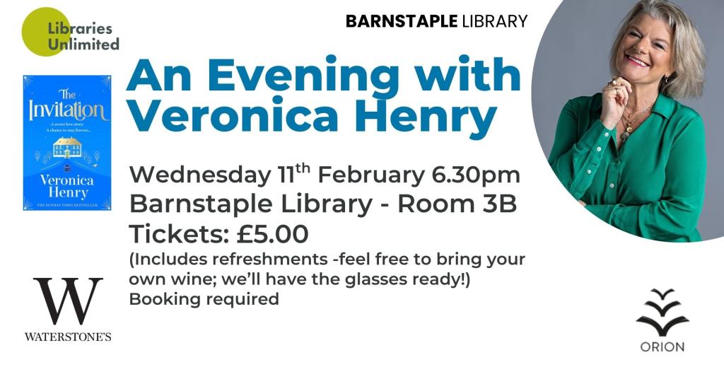 Join author Veronica Henry to celebrate the publication of her new book The Invitation. Veronica will be in conversation with Barnstaple Library Senior Supervisor Lisa D'Alberti.