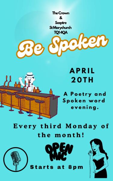 Be-Spoken. Spoken-word open-mic at The Crown and Sceptre St Marychurch 8pm Monday 20/04/2026