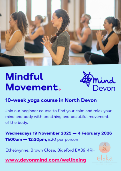 10 Mindful Yoga sessions for beginers available through a collaboration between Devon Mind and Elska Yoga. The course costs £20, paid upfront, for the 10 sessions starting November 19th. Please follow this link for further details and to book your place: https://www.devonmind.com/find-help/wellbeing-activities