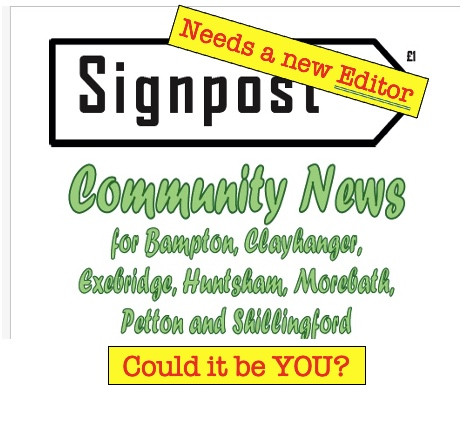 This is a monthly publication distributed in Bampton and the surrounding villages (10 issues a year). Signpost is a CIC and has an active commitee led by Peter Stott as Chair. The current editor is retiring and therefore a replacement is needed.