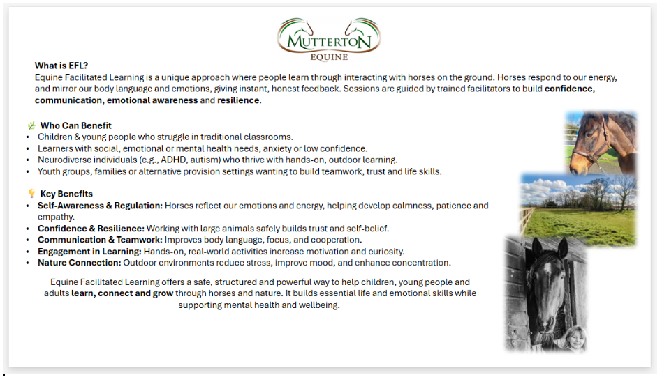 Equine Facilitated Learning offers a safe, structured and powerful way to help children, young people and adults learn, connect and grow through horses and nature. It builds essential life and emotional skills while supporting mental health and wellbeing.