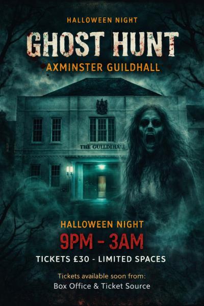 Step into the shadows this Halloween Night at Axminster Guildhall for a spine-chilling Ghost Hunt experience from 9PM to 3AM. Explore the historic building after dark as you investigate its eerie corners, uncover its haunted history, and take part in a night of paranormal investigation.