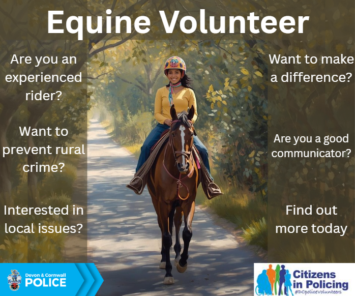 This scheme enables experienced horse riders with local knowledge to assist Devon & Cornwall Police by sharing relevant information and supporting rural policing activities. Volunteers will help improve understanding of issues affecting rural areas and contribute to efforts to prevent crime and anti-social behavior, while carrying out their normal riding activities.