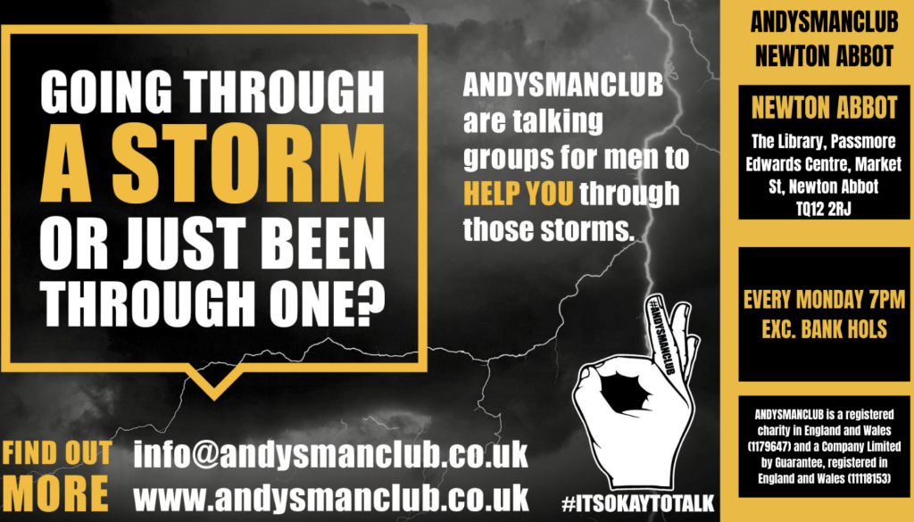 Andys Man Club is a suicide prevention charity. Andys Man Club run peer to peer mental health support groups for any man aged 18+ 7-9pm every Monday (except Bank Holidays)