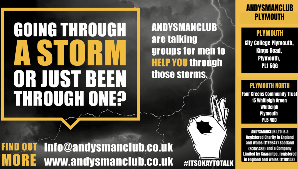 Andys Man Club is a suicide prevention charity. We run peer to peer talking groups for any man aged 18+ 7-9pm every Monday (except Bank Holidays)