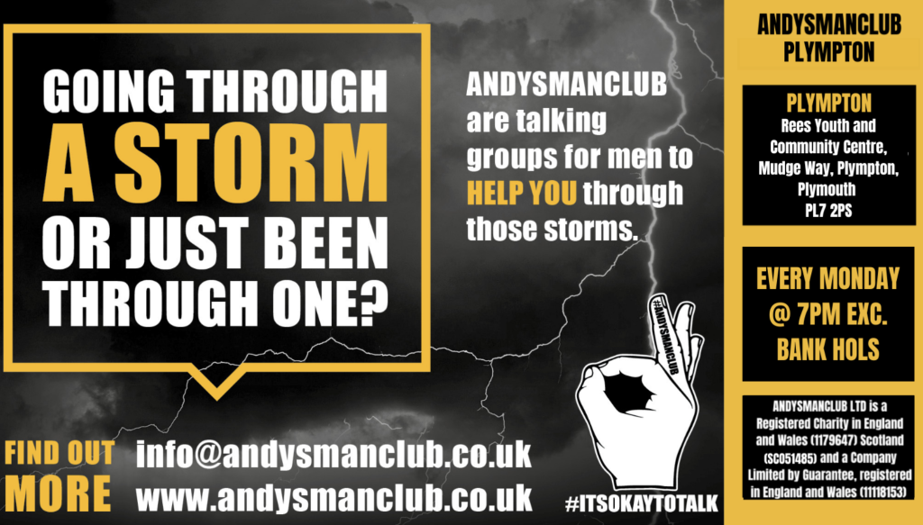 Andys Man Club is a suicide prevention charity. We run peer to peer talking groups for any man aged 18+ 7-9pm every Monday (except Bank Holidays)
