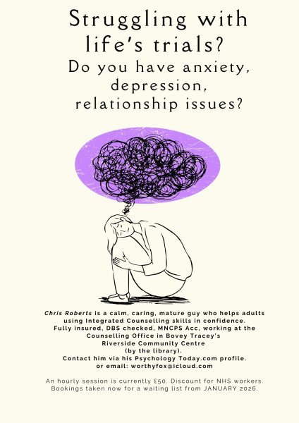 Chris Roberts is a calm, caring, mature guy who helps adults using Integrated Counselling skills in confidence. Fully insured, DBS checked, MNCPS Acc, working at the Counselling Office in Bovey Tracey’s Riverside Community Centre (by the library). Contact him via his Psychology Today.com profile.