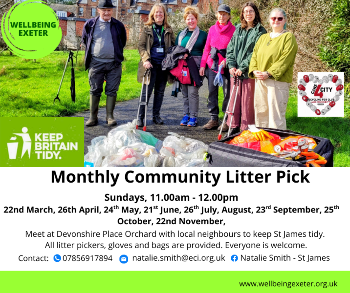 Meet at Devonshire Place Orchard at 11.00am for an hour of litter picking. Dates are on poster!