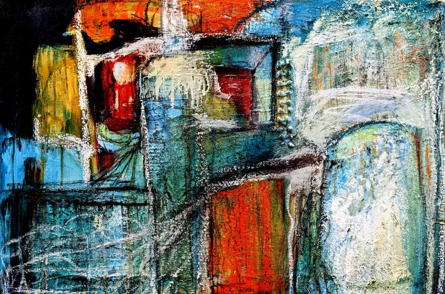 In September 2019, Robert Mountjoy took an unscheduled trip to Spain, visiting Andalucía and its historic sites. He took a sketchbook and a camera and came back full of new ideas, minimalist forms and textures, but most of all colours— reds – both intense and bleached out, with deep yellows and dusty grey/blues. He spent some weeks playing with figurative landscapes based on the drawings, but felt he was not producing anything new or exciting. Looking back through his photographs, he found a batch where he had accidentally nudged camera settings to wide angle and continued to shoot before noticing the mistake. The resulting images showed views through narrow streets from one plaza to another with ‘barrel’ distortion… and these resonated with a series of abstract collage sketches he had been experimenting with. The artist adapted and scaled up some of his collages; overlapping convex sided lozenges and painting them with the hot dry colours and textures recalled from the recent travels. Working on HDF or canvas boards, he built up layers of colour and texture over hard edged forms with contrasting gaps. He showed two of the first paintings in the Penwith Gallery, St Ives with the South West Academy 2020 Exhibition. He destined another four to the 21 Group Exhibition that year, also at Penwith. The colours became more intense as the series continued and the stripped-down forms less architectural. Three of the later paintings in this sequence was included in the SWAc Reflection 2020 Exhibition. Four paintings were shown with the 21 Group at the Limekiln Gallery, Calstock from April to June 2021, two at the Artizan Gallery in Torquay and six more at the September 2021 Exhibition in St Ives.
