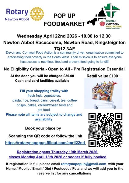 Pop-Up Food Market on Wednesday 22nd April @ Newton Abbot Racecourse, Newton Road, Kingsteignton TQ12 3AF. Shopping slots 10.00 - 12.15. Shoppers will be charged £30 at the door. Cash and card facilities are available.