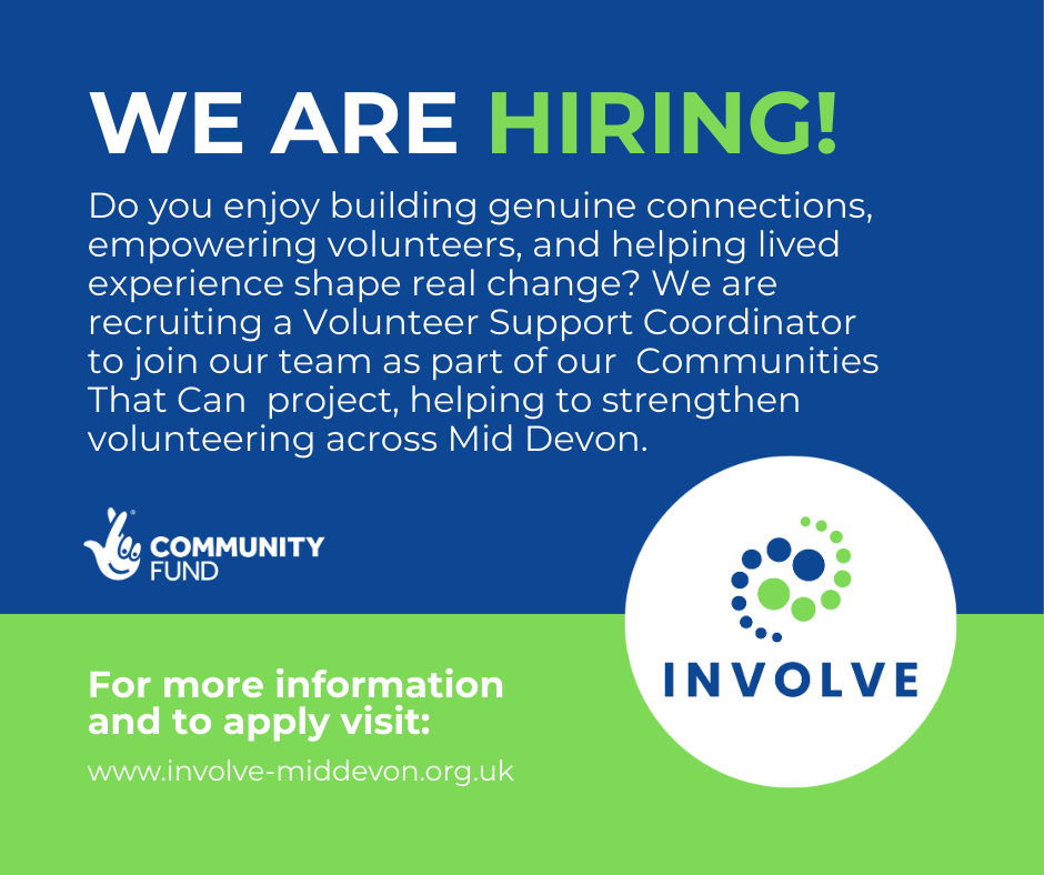 We’re recruiting a part-time Volunteer Support Coordinator to help grow volunteering across Mid Devon and support the development of our new Volunteer Hub in Tiverton, as part of our Big Lottery funded Communities That Can project.