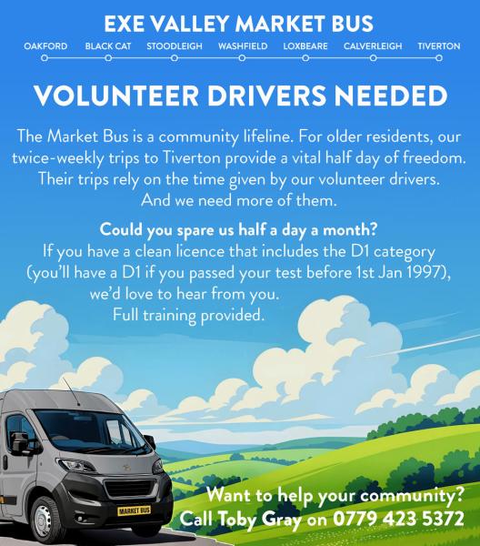 The Market Bus is a community lifeline. For older residents, our twice-weekly (Tuesdays and Fridays) trips from Oakford to Tiverton provide a vital half day of freedom. Their trips rely on the time given by our volunteer drivers. And we need more of them.