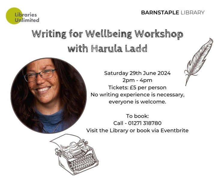Book at the library 01271 318780 or via Eventbrite https://www.eventbrite.co.uk/e/writing-for-wellbeing-with-harula-ladd-tickets-903743078877?